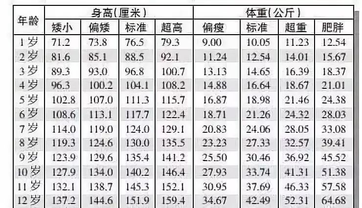 1-12岁身高体重对照表 1-12岁体重对照表