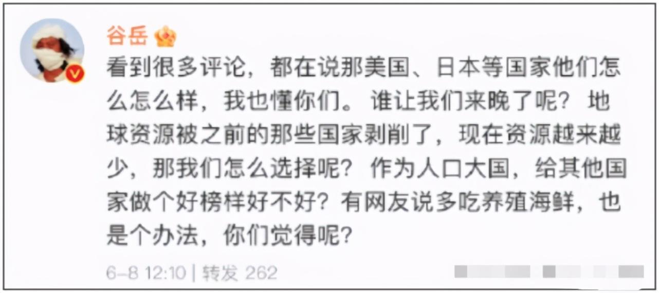 美籍华裔大V谷岳也在以中国人的口吻劝中国人少吃海鲜,一张嘴就是海洋鱼类等资源面临枯竭,中国人要以身作则。