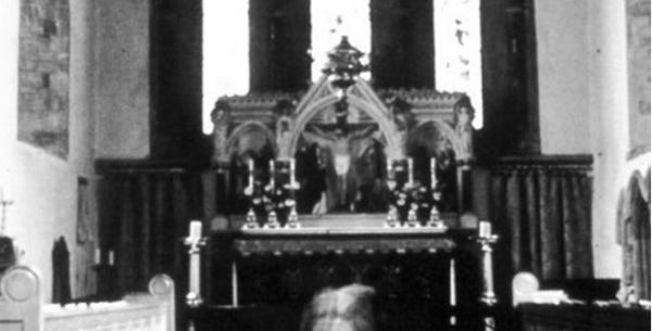 1964年,戈登·卡罗尔在北安普敦郡伍德福德村参观了圣玛丽和万圣会,并拍下了这张照片。它显示出一个半透明的人似乎在祭坛前祈祷,这是在检查打印出来的照片时才显示出来的。